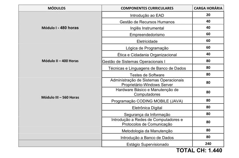 MATRIZ CURRICULAR: A grade curricular do curso Técnico em em Manutenção e Suporte para Informática, segue todos os requisitos legais perante a legislação federal e estadual e é composta pelas seguintes disciplinas: