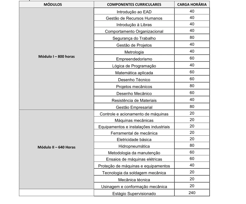 MATRIZ CURRICULAR: A grade curricular do curso Técnico em Mecânica Industrial, segue todos os requisitos legais perante a legislação federal e estadual e é composta pelas seguintes disciplinas: